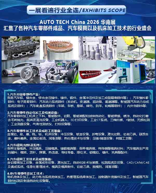 在产业结构调整与全球化竞争加剧的当下,AUTO TECH广州零部件展以战略区位为依托,以精准品类为核心,以广阔市场为支撑,为行业提供了一个技术交流、资源整合与商业合作的优质平台。这场初冬的行业盛会,或将成为汽车零部件产业高质量发展的重要助推器。2026年11月27日-30日,广州·中国进出口商品交易会展馆D区,期待您的莅临!更多精彩等待您现场解锁!详情请点击:http://www.autoprocessingexpo.com参展/参观联系人:汪女士177 2452 1438 wangcuiping@jswatsonexpo.com