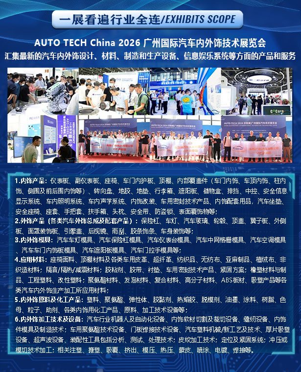 这场聚焦汽车内外饰创新的行业盛会,不仅是技术与产品的展示平台,更是产业趋势的风向标。2026年11月27日至30日,广州琶洲将汇聚全球行业智慧,共同探索汽车空间的未来可能,为产业升级注入持久动力。更多精彩等待您现场解锁!详情请点击https://www.china-autotech.com/参展/参观联系人:汪女士177 2452 1438 wangcuiping@jswatsonexpo.com