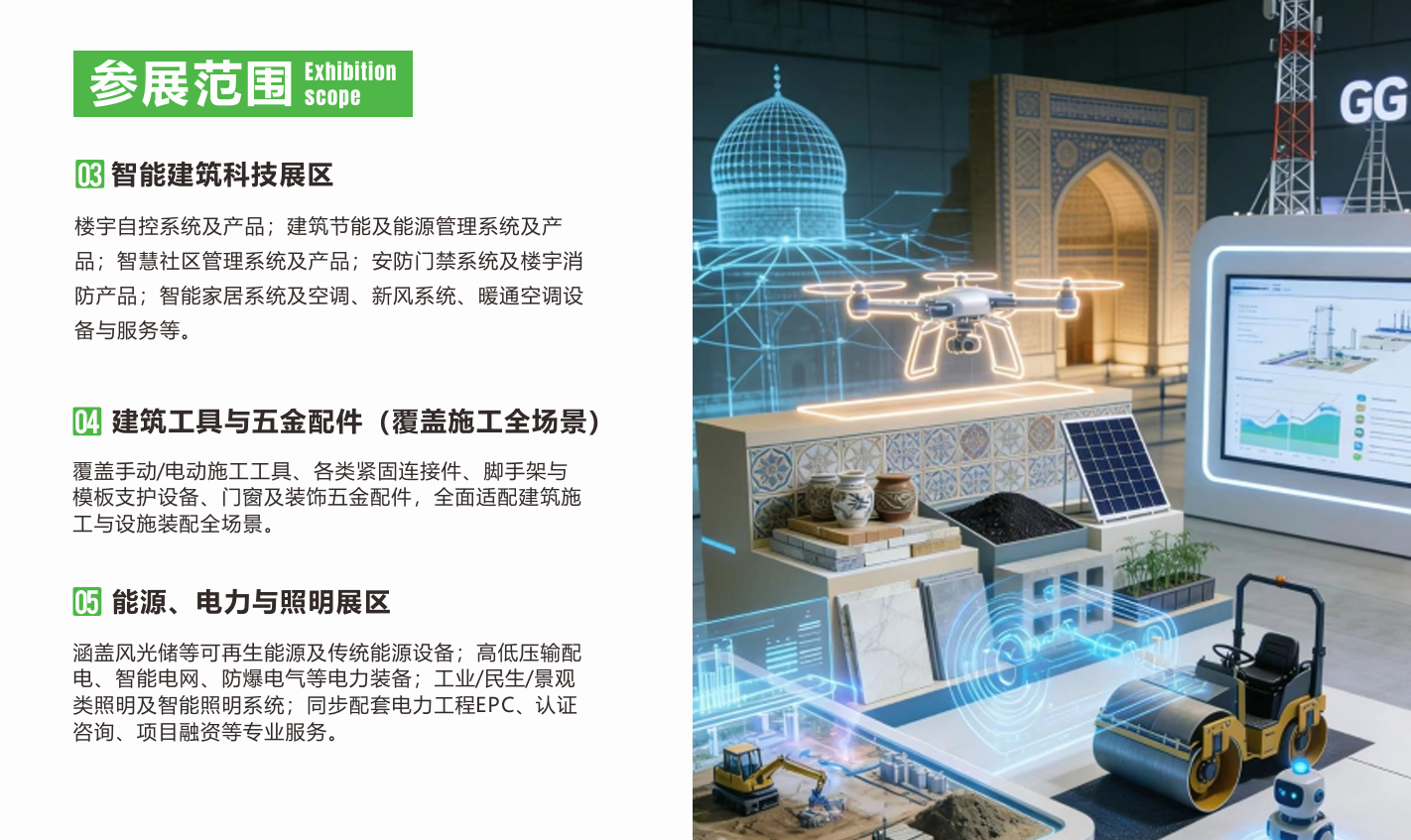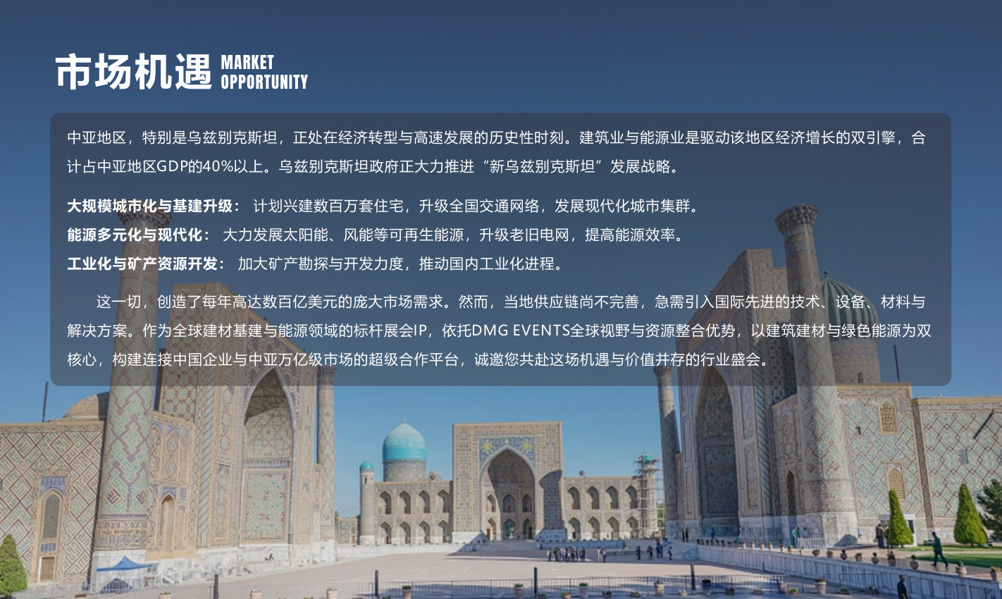 展会P作为全球建材基建与能源领域的标杆性展会,依托DMG EVENTS的全球视野与资源整合优势,以建筑建材与绿色能源为双核心,搭建起中国企业与中亚市场的高效合作桥梁。诚邀行业伙伴共赴盛会,携手挖掘区域发展潜力,共享产业合作新机遇。