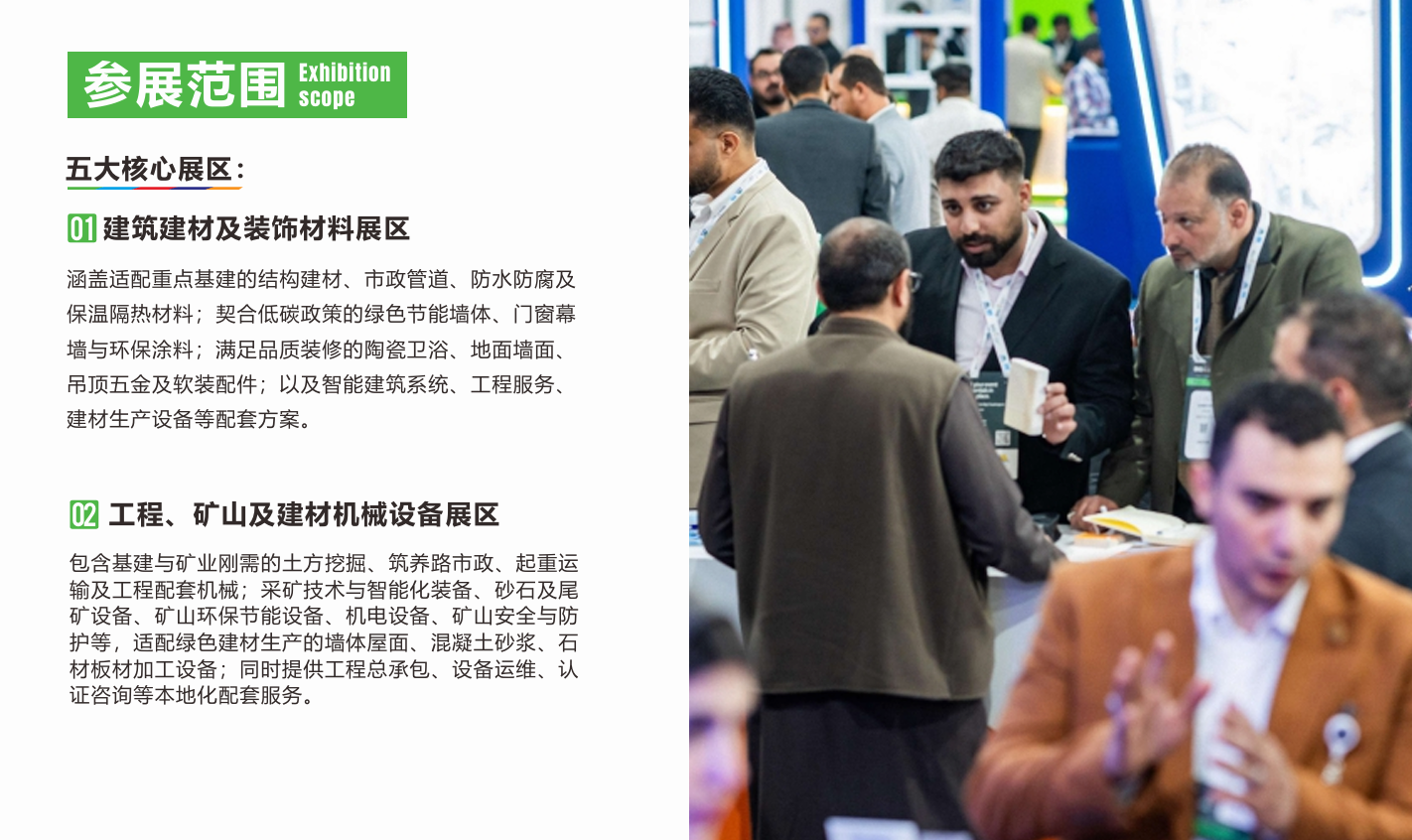 2. 工程、矿山及建材机械设备展区:土方挖掘、起重运输机械、采矿智能化装备、矿山环保设备、建材生产加工设备,及工程总承包、设备运维等服务。