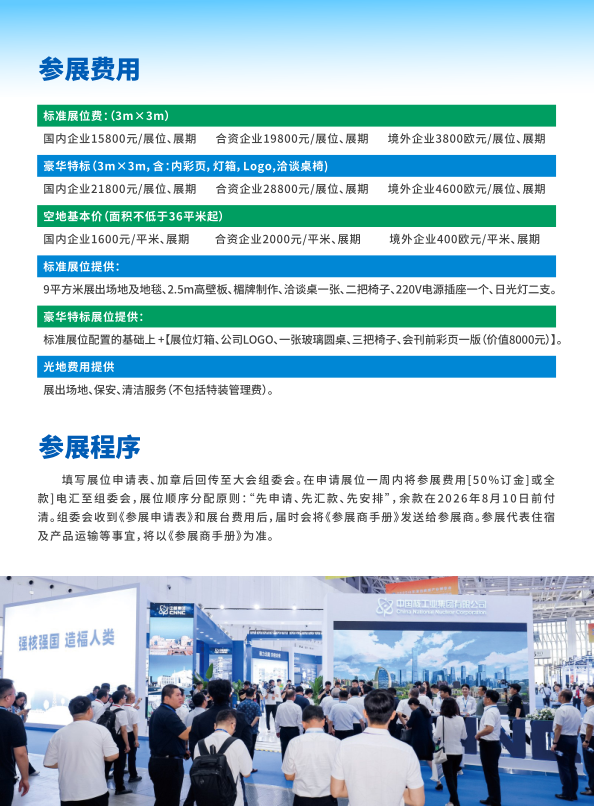 填写展位申请表、加章后回传至大会组委会。在申请展位一周内将参展费用[50%订金]或全款]电汇至组委会,展位顺序分配原则:“先申请、先汇款、先安排”,余款在2026年8月10日前付清。组委会收到《参展申请表》和展台费用后,届时会将《参展商手册》发送给参展商。参展代表住宿及产品运输等事宜,将以《参展商手册》为准。