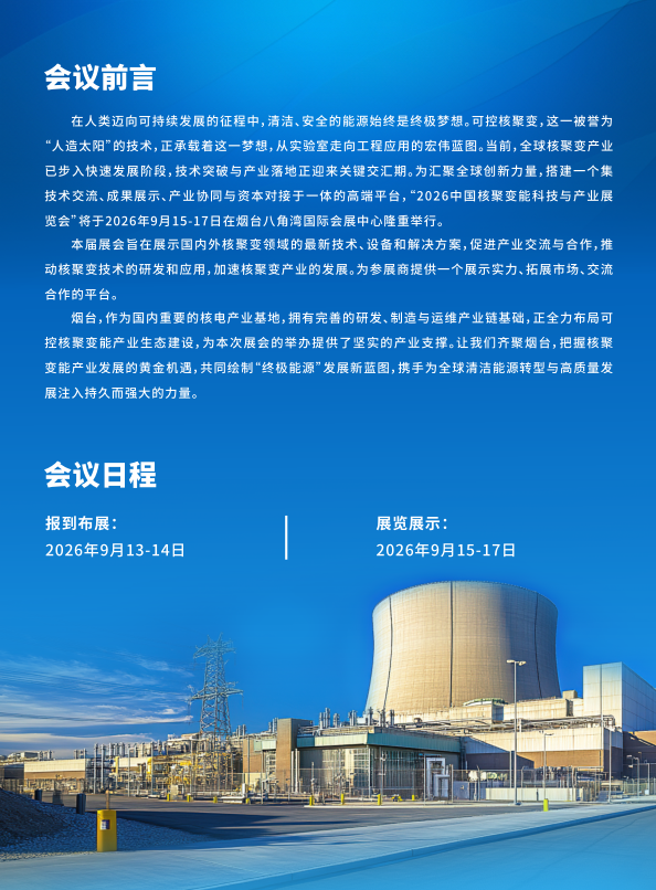 在人类迈向可持续发展的征程中,清洁、安全的能源始终是终极梦想。可控核聚变,这一被誉为“人造太阳”的技术,正承载着这一梦想,从实验室走向工程应用的宏伟蓝图。当前,全球核聚变产业已步入快速发展阶段,技术突破与产业落地正迎来关键交汇期。为汇聚全球创新力量,搭建一个集技术交流、成果展示、产业协同与资本对接于一体的高端平台,“2026中国核聚变能科技与产业展览会”将于2026年9月15-17日在烟台八角湾国际会展中心隆重举行。